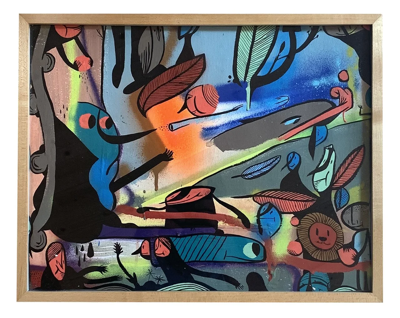 Nick Zaremba’s studio art fuses bold color, layered textures, and playful abstraction across paintings and sculptural assemblages, often incorporating spray paint, acrylics, and found wood. His work channels a raw, intuitive energy—balancing street art aesthetics with fine art sensibilities—creating pieces that feel both spontaneous and deeply personal.