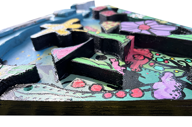 A series of 3D mixed media pieces on wood triangle shapes. Assorted sizes - two 18" and two 12" and two 6"